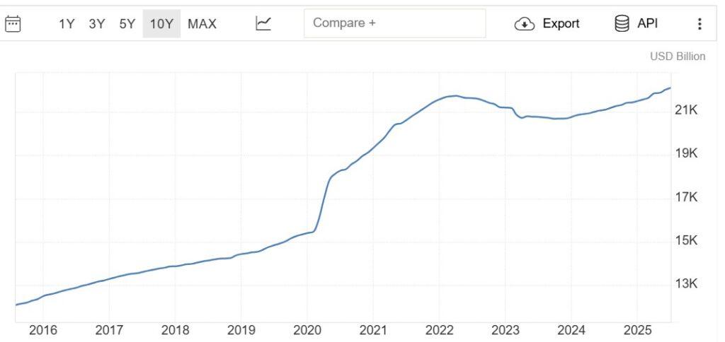 I kontrast till detta har traditionella valutor, som dollar eller euro, ingen övre gräns. Centralbanker kan trycka nya pengar när de vill, vilket leder till inflation och minskad köpkraft över tid. Se exempel på hur många fler USD som skapats – bara de senaste 10 åren.